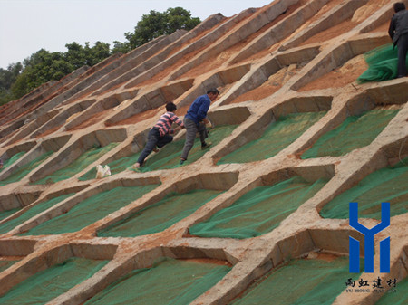施工前準備,如工具、人員配備、覆蓋充填物、草種等;對邊坡進行修整,使之盡可能的平整; 在坡頂開挖暗溝,尺寸為寬1米,深1米; 貼著地面由上至下將三維網卷材展開,卷材頂端固定于暗溝內,相鄰兩卷材料相互搭接,并要求搭接寬度不小于10厘米,并用軟鐵制成的U型地釘進行固定,鋪設時網狀面朝上,多余卷材用剪刀裁剪;田野風介紹播灑草種,可選用百慕大草或百喜草,草種用量為12克/平方米;人工回填細砂質營養土,厚度不***過三維網的一半高度,再灑草種,回填土至剛好填滿,然后輕微壓實、整平; 如氣候較干燥,水分散失較快,可采用草袋或無紡布覆蓋,澆水養護; 在植被發育期間,每天澆水兩次,養護期約十天; 當植被生長成型,根系已穿過三維網,即可撤去上覆的草袋或無紡布。 維植被網護坡滿足了路基邊坡坡面的保護和加固的要求,保證了路基不致因雨水沖刷和氣候變化而破壞,而且兼顧了道路景觀和環境協調。已引起了大家的關注,在實際工程中已大量采用,具有廣闊的發展前景。